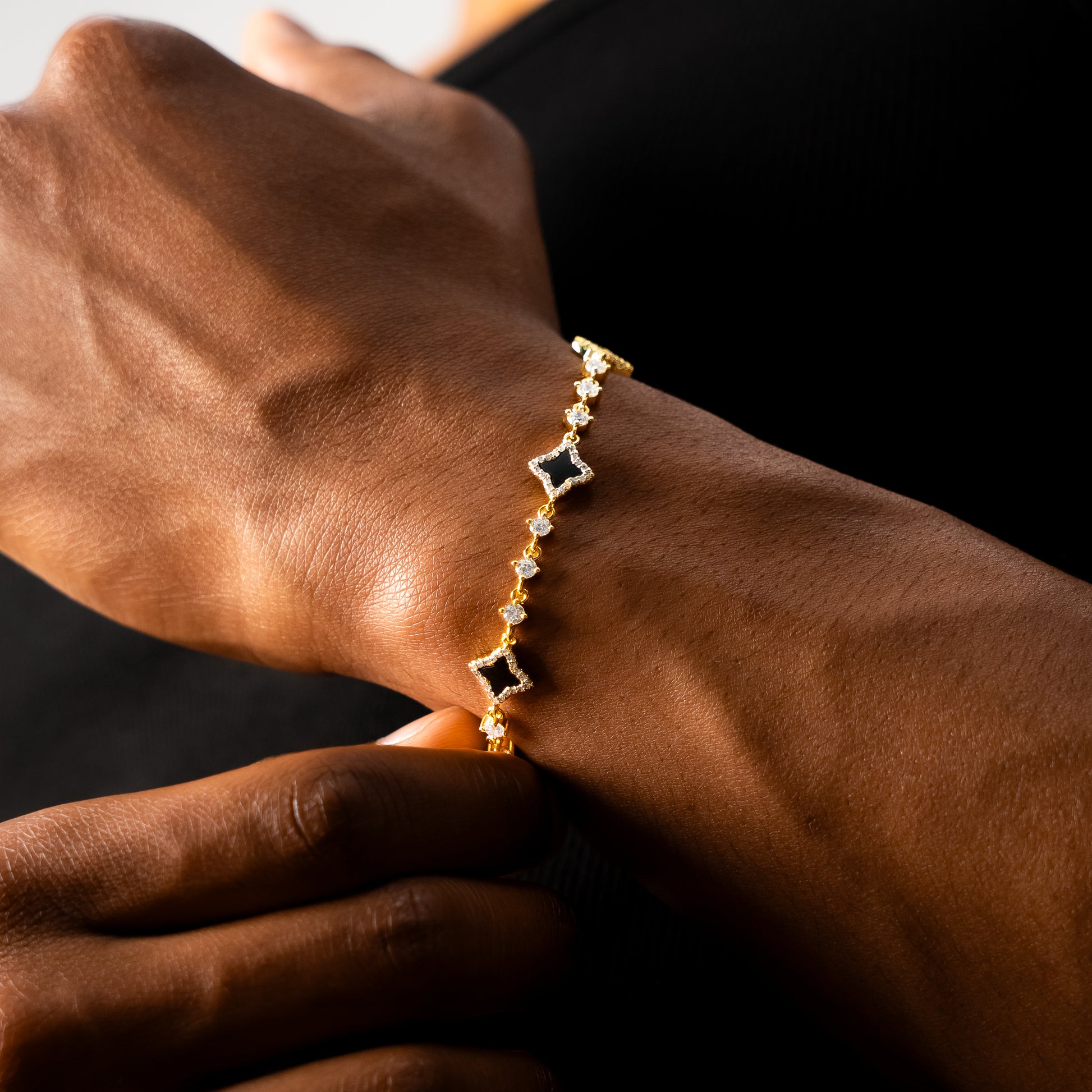Découvrez notre Bracelet Flower Tennis, une pièce exquise qui marie l'élégance intemporelle du bracelet tennis et la délicatesse des fleurs. Chacune des fleurs, ornée d'une pierre imitation onyx et d'une épaisseur de 8 mm, ajoute une touche de charme et de sophistication à ce bracelet de 3 mm.
