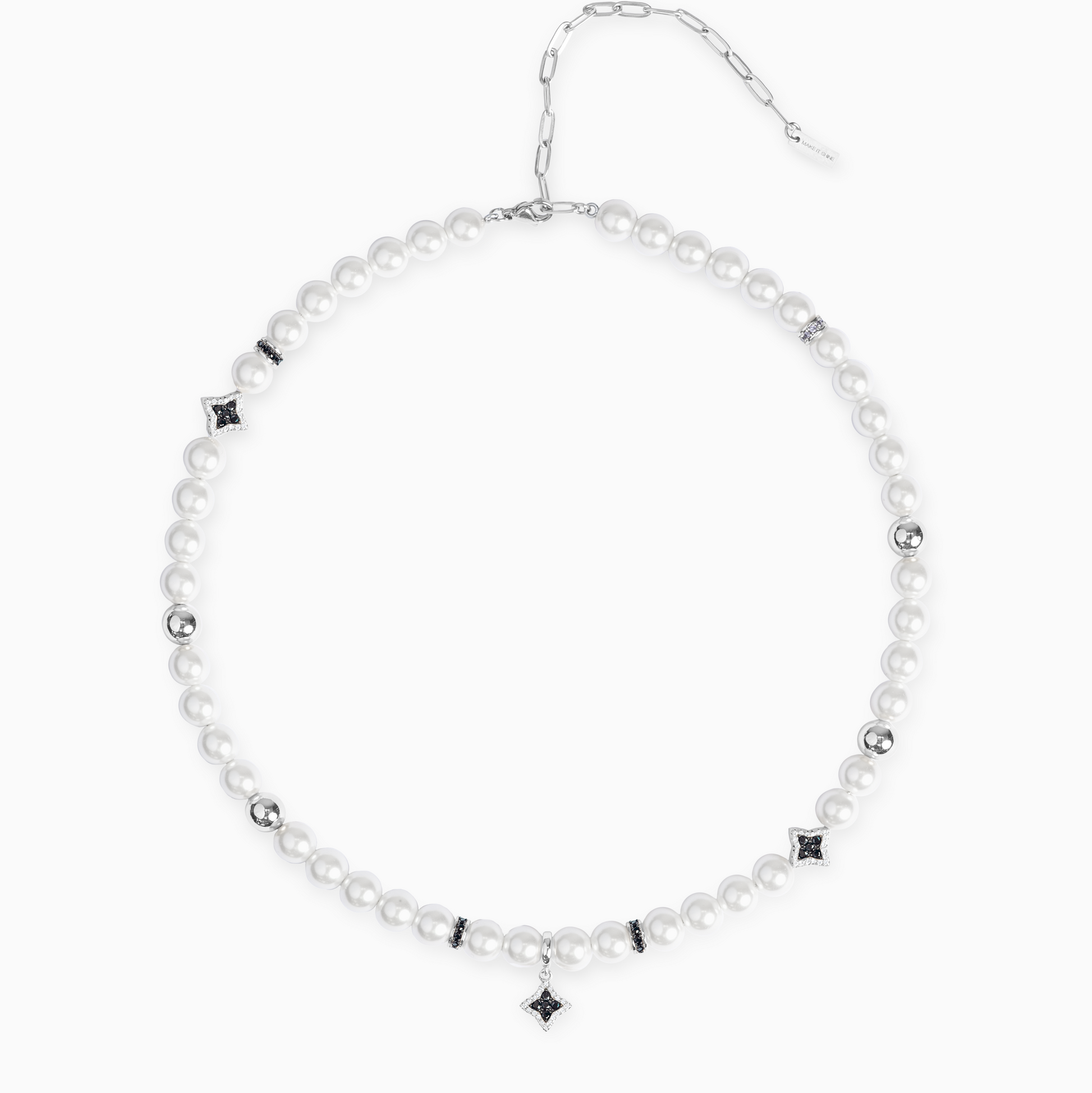 Découvrez notre chaîne Flower Pearl, une pièce raffinée qui allie la douceur des perles à l’éclat de détails floraux. Ornée de perles blanches de 8 mm, ponctuée de quelques perles argentées, cette chaîne se distingue par trois fleurs scintillantes incrustées de pierres noires. L’une d’elles, suspendue en pendentif, vient sublimer l’ensemble avec une touche aérienne et lumineuse.