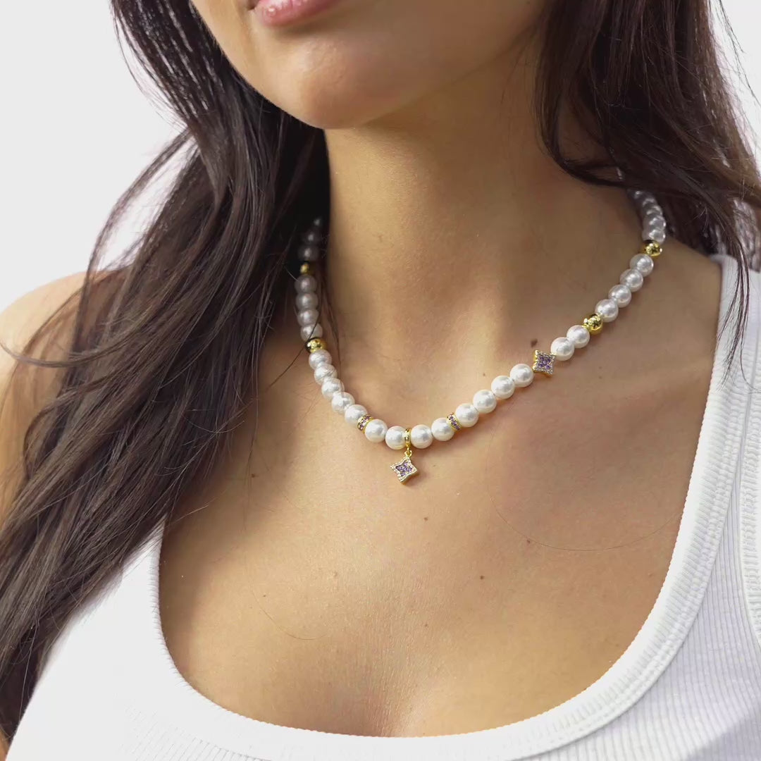 Découvrez notre chaîne Flower Pearl, une pièce raffinée qui allie la douceur des perles à l’éclat de détails floraux. Ornée de perles blanches de 8 mm, ponctuée de quelques perles dorées, cette chaîne se distingue par trois fleurs scintillantes incrustées de pierres violettes. L’une d’elles, suspendue en pendentif, vient sublimer l’ensemble avec une touche aérienne et lumineuse.