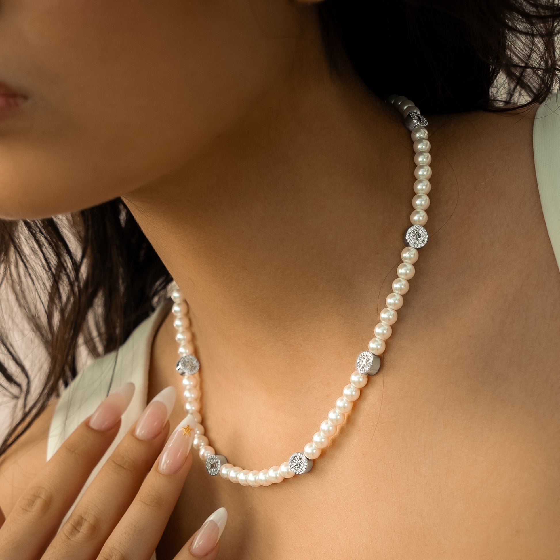 Découvrez notre Chaîne perlée Monogramme, un bijou élégant et sophistiqué qui ne passe pas inaperçu. Conçue avec un souci du détail méticuleux, cette chaîne présente des perles de 6 mm ainsi que des éléments finement travaillés, chacun orné de pierres étincelantes et de notre monogramme distinctif.