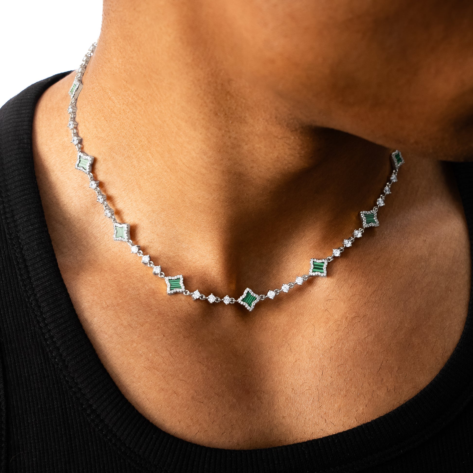 Découvrez notre Chaîne Flower Tennis, une pièce exquise qui marie l'élégance intemporelle de la chaîne tennis et la délicatesse des fleurs. Chacune des fleurs, ornée d'une pierre imitation malachite et d'une épaisseur de 8 mm, ajoute une touche de charme et de sophistication à cette chaîne de 3 mm.