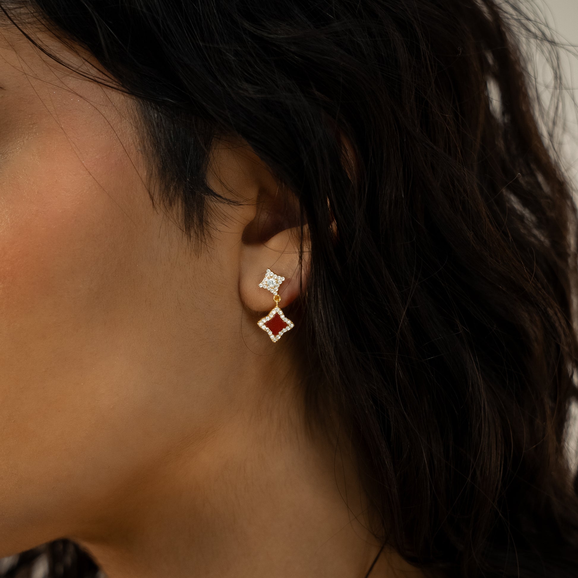 Découvrez les boucles d'oreilles Stars & Flowers, un mariage parfait entre éclat et délicatesse. Ces boucles pendantes de 2 cm se distinguent par une étoile sertie d'oxydes de zirconium scintillants, accompagnée d'une fleur ornée d'une pierre imitation cornaline qui descend gracieusement.