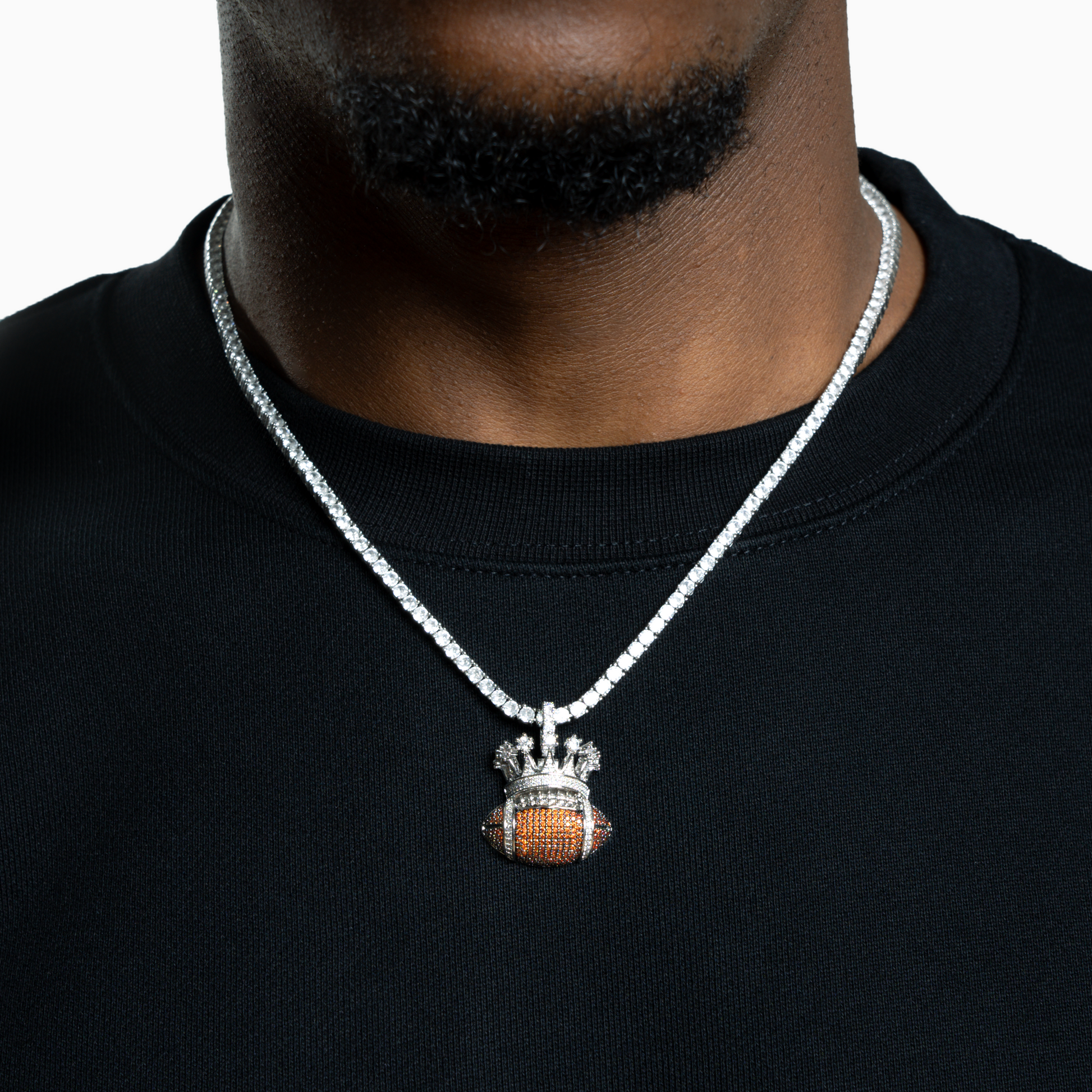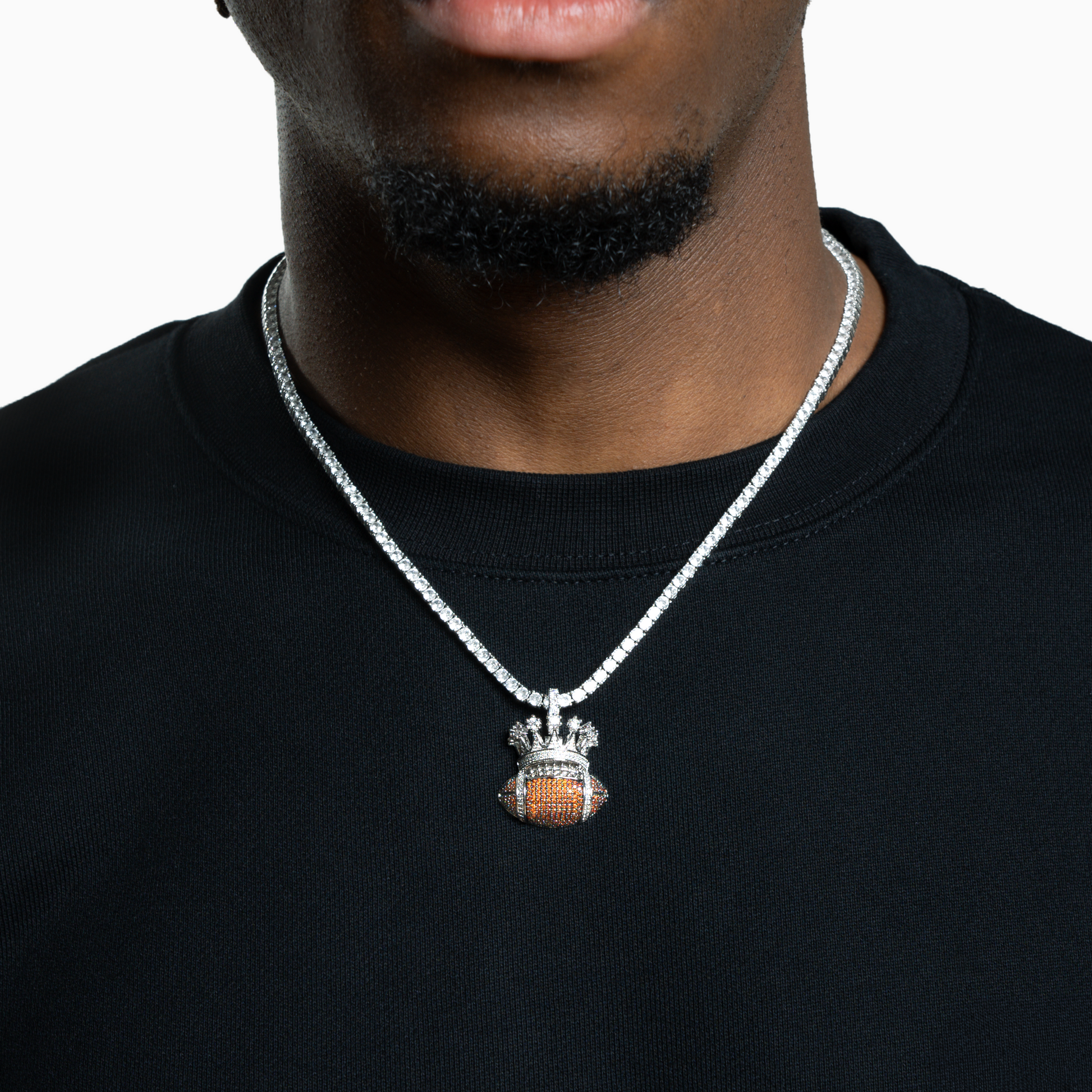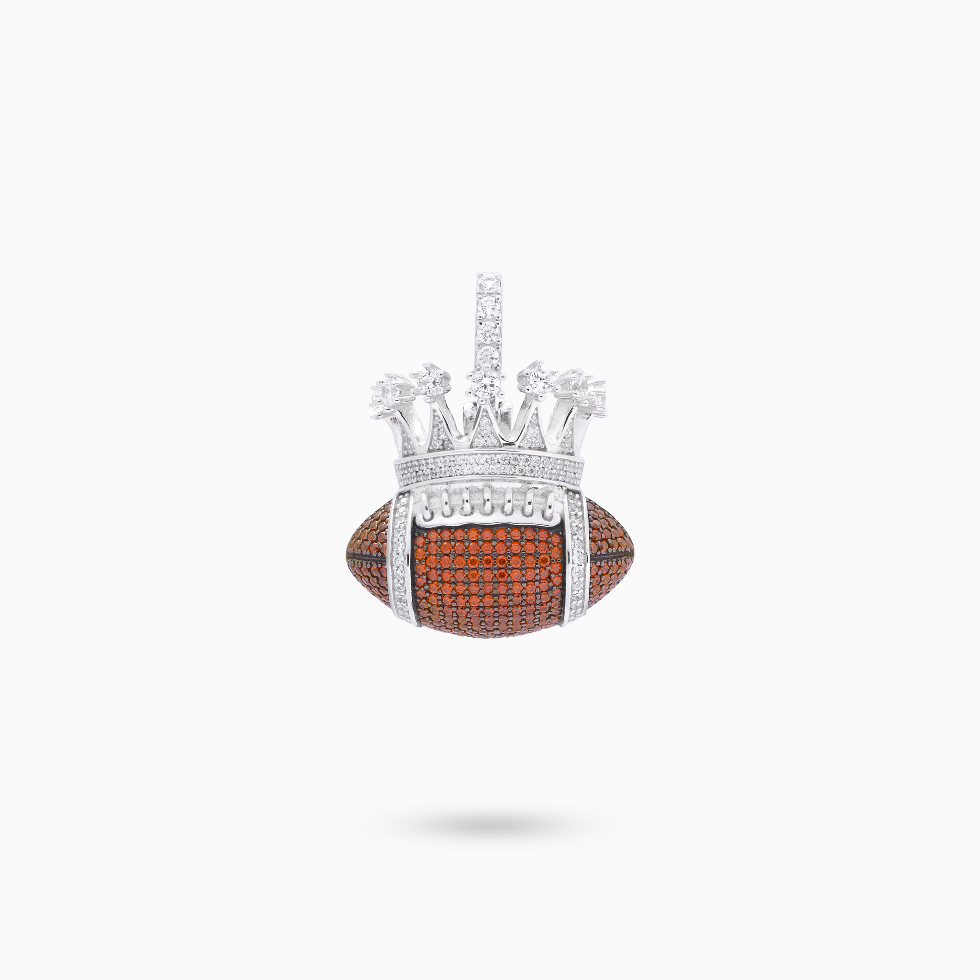 Discover the King of the Field pendant, a bold piece of jewelry created in collaboration with Léo Sarteel and designed for American football fans. This unique pendant combines strength and prestige: an American football meticulously paved with orange-colored stones for an authentic look, crowned with a royal crown adorned with sparkling zirconia.