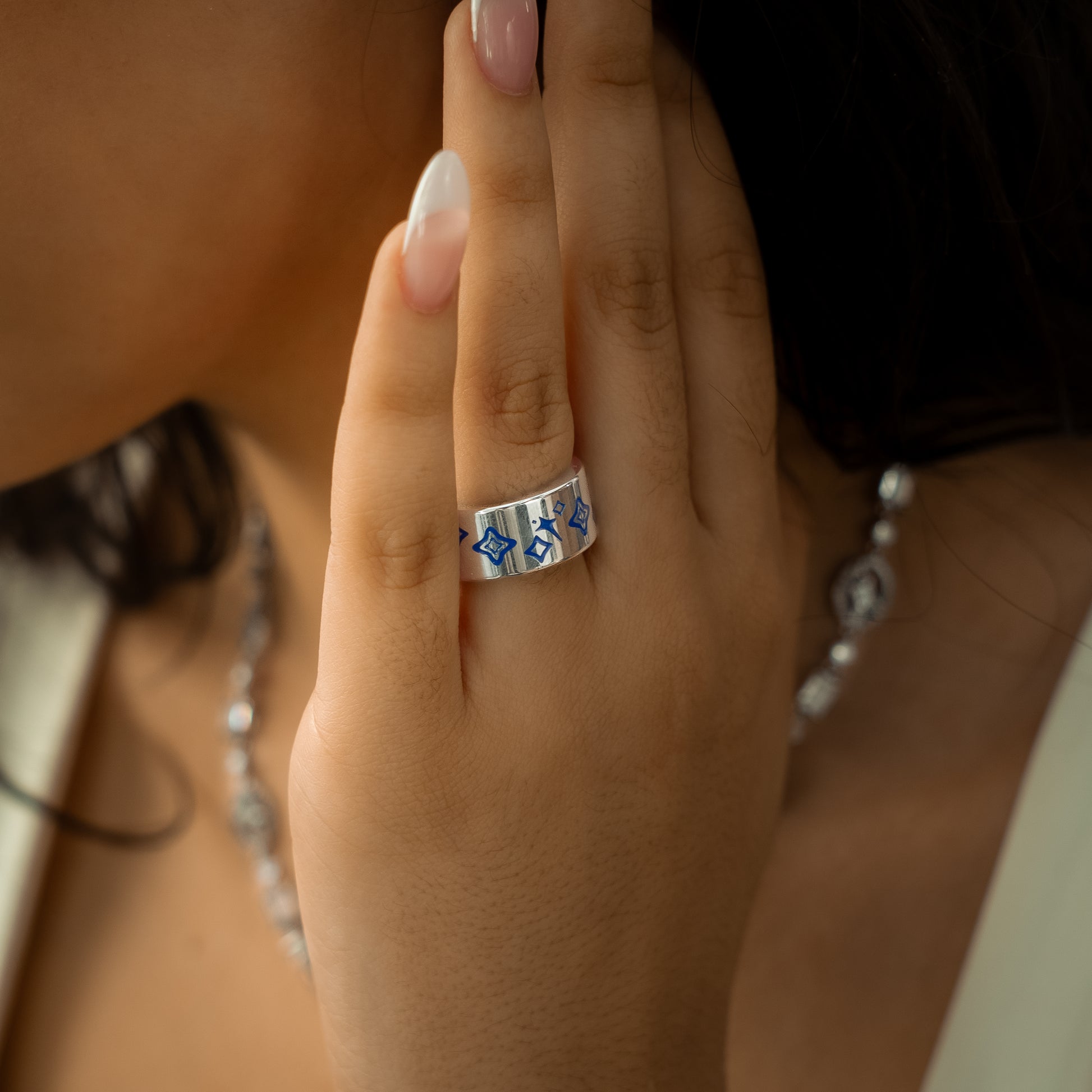 Discover the Stars & Flowers Band ring , a distinctive 10mm wide piece. Adorned with floral and star motifs in blue enamel, this ring combines elegance and originality.