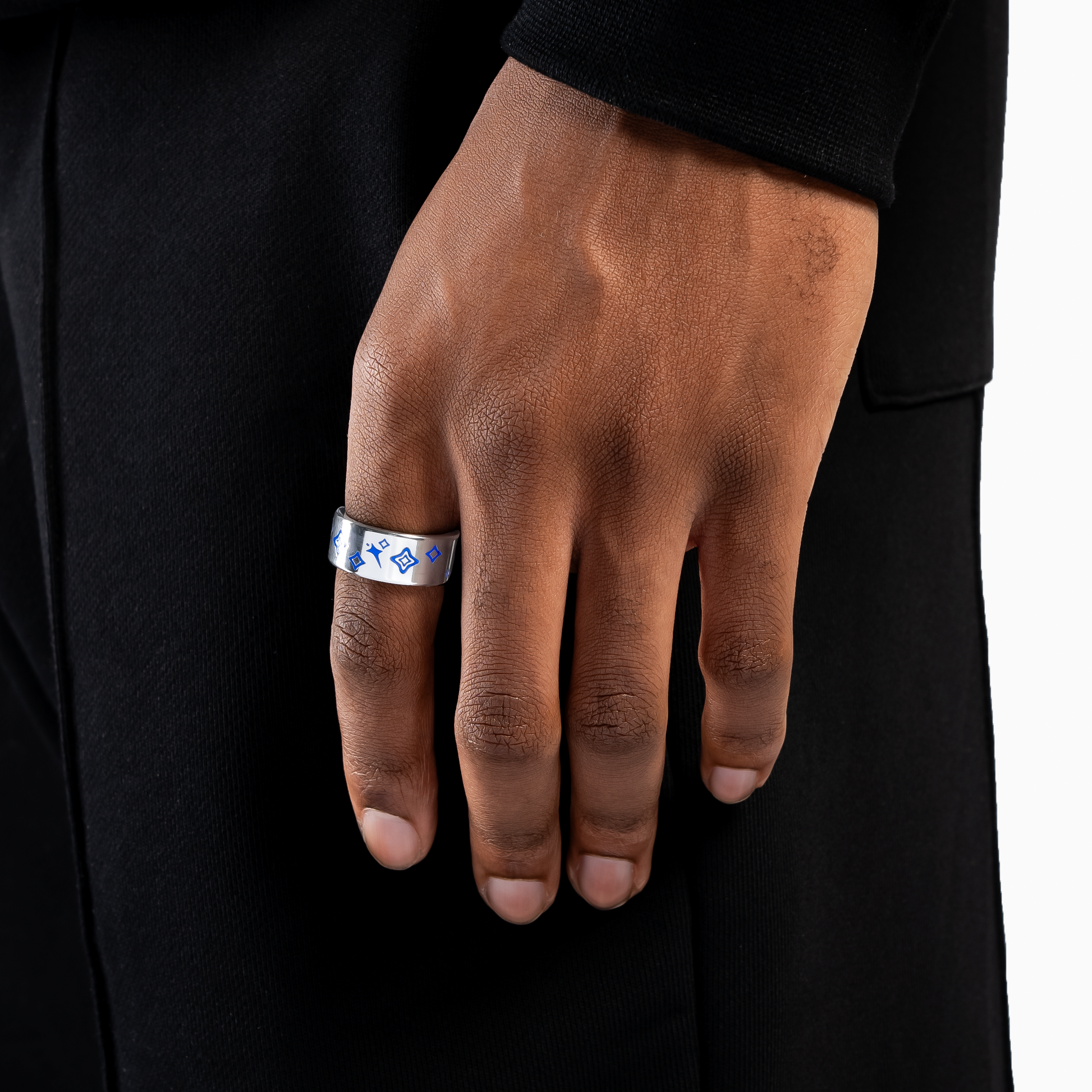 Discover the Stars & Flowers Band ring , a distinctive 10mm wide piece. Adorned with floral and star motifs in blue enamel, this ring combines elegance and originality.