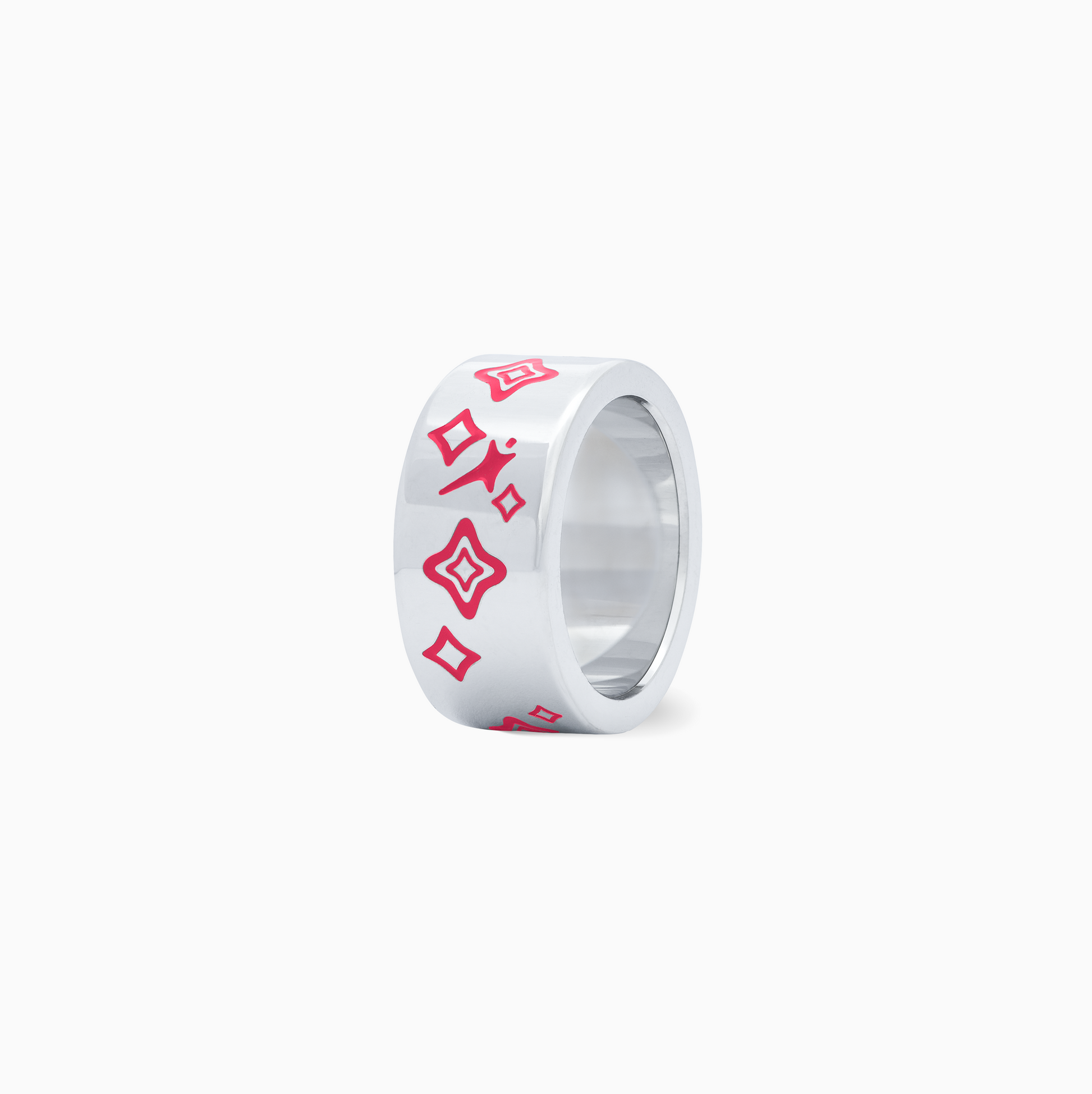 Discover the Stars & Flowers Band ring , a distinctive 10mm wide piece. Adorned with floral and star motifs in red enamel, this ring combines elegance and originality.
