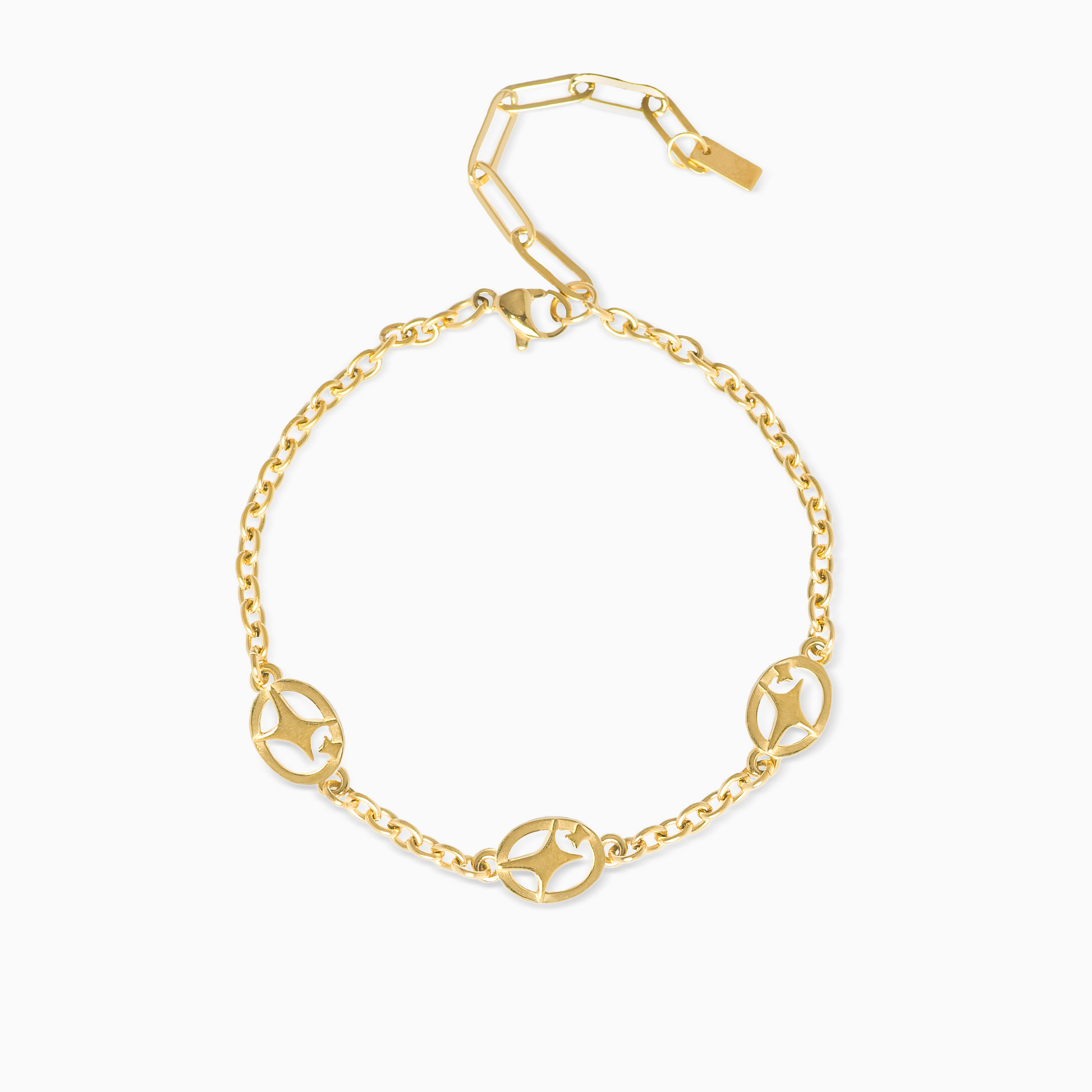 Discover our Signature Bracelet, an elegant piece that combines modernity and sophistication. Adorned with refined links, this bracelet is embellished with three openwork oval motifs, each engraved with the iconic Make it Shine star, a symbol of style and finesse. Its cable chain ends with a secure clasp and an extension, allowing a perfect fit to your wrist.