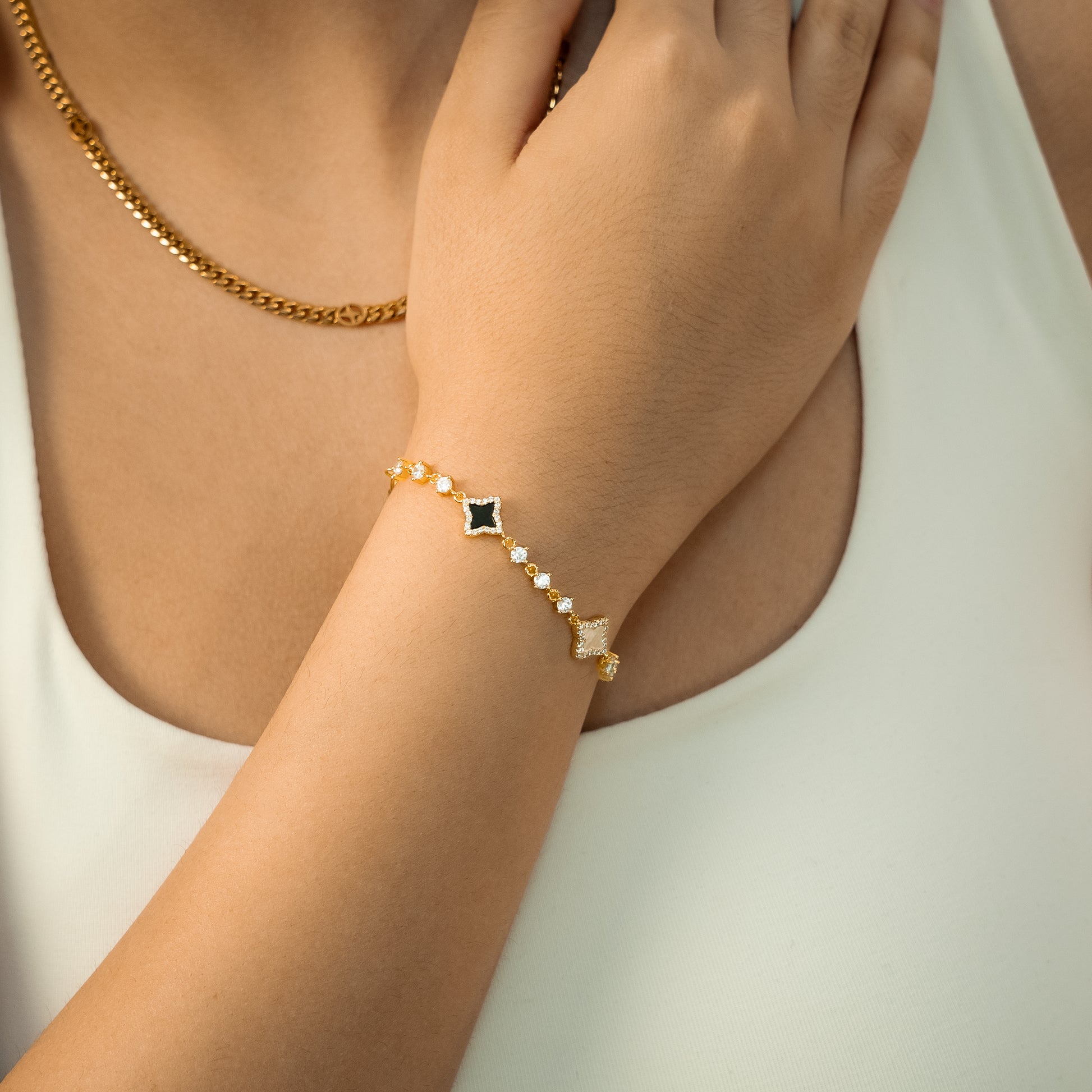 - Gold-finish metal jewelry & CZ stones (yellow, white, or rose): Each layer is precisely applied for a high-quality finish and lasting brilliance. To preserve the shine, avoid contact with water, sweat, and chemicals. Remove before showering, swimming, or exercising.