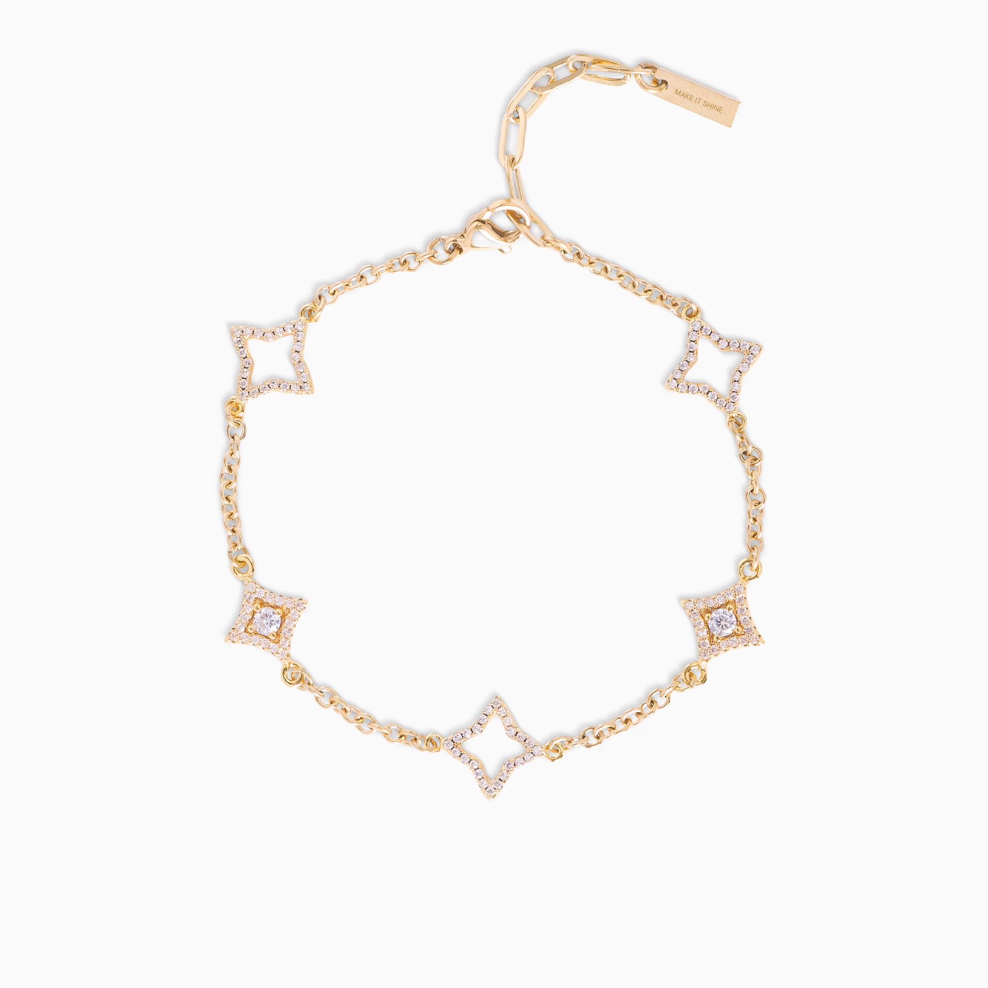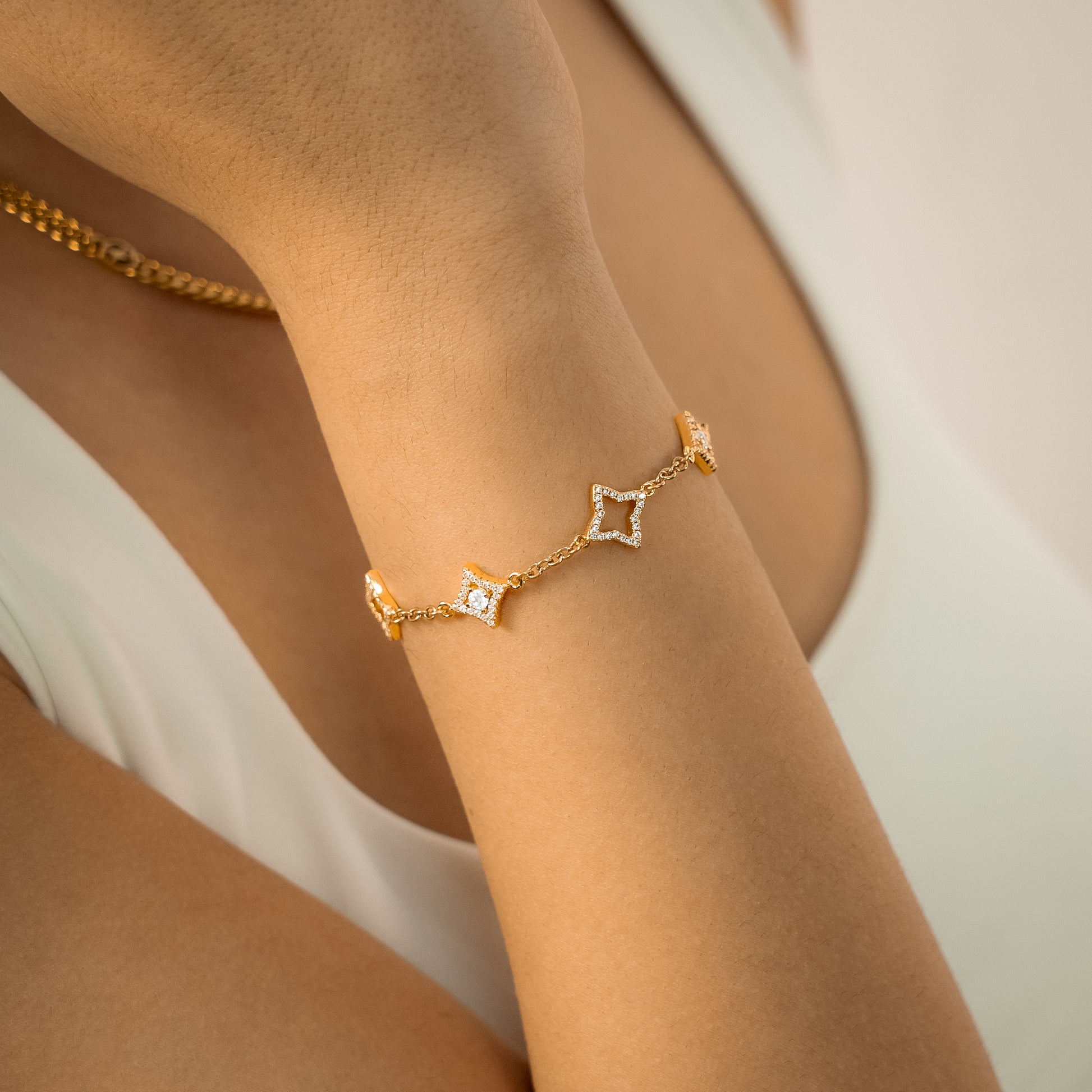 Introducing our Mixed Star & Flower Bracelet, an elegant combination of bright stars and delicate flowers. Each star, adorned with a sparkling stone, illuminates this 3mm cable chain. The hollow flowers, decorated with sparkling stones, give a perfect balance between radiance and refinement.