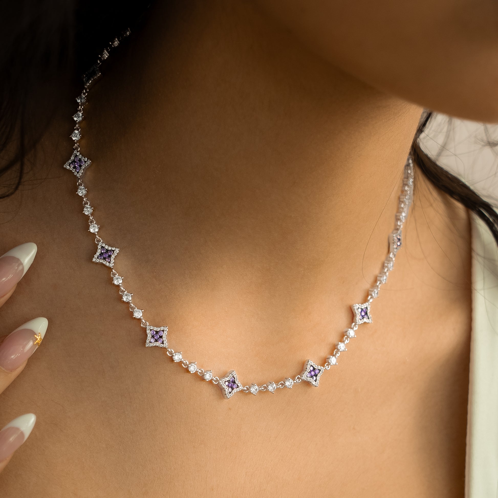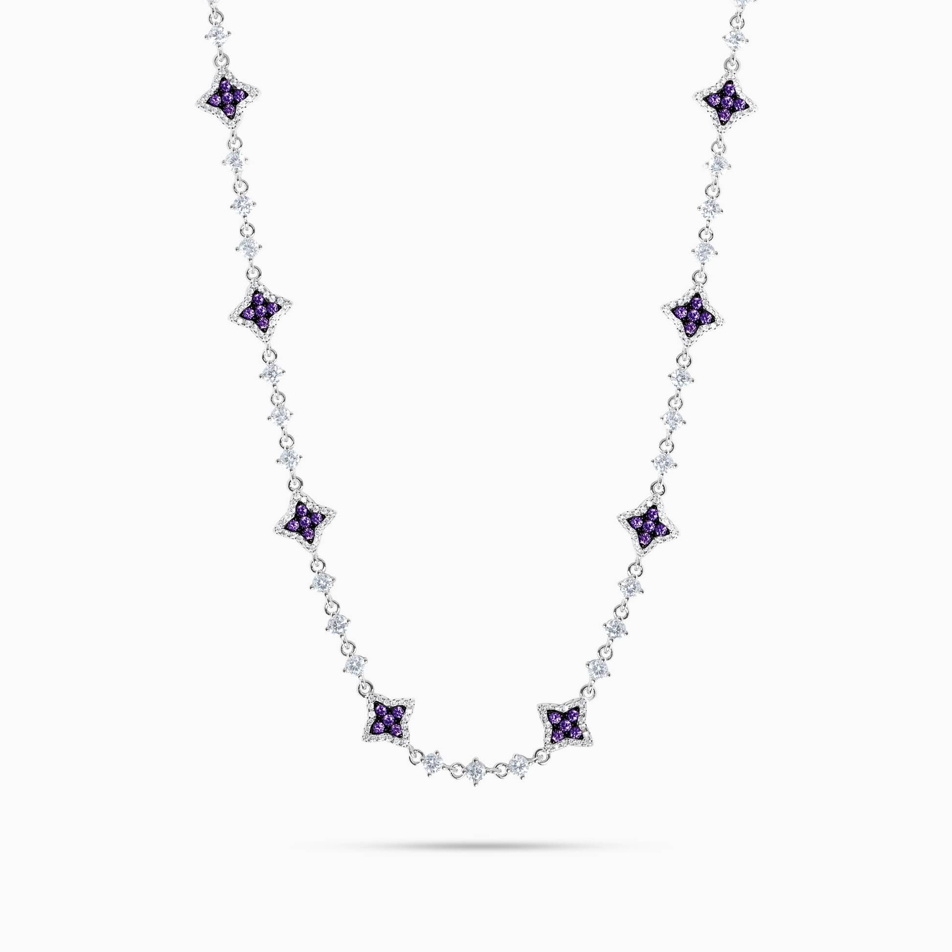 Discover our Flower Tennis Chain, an exquisite piece that combines the timeless elegance of the tennis chain with the delicacy of flowers. Each of the flowers, adorned with sparkling purple stones and measuring 8 mm thick, adds a touch of charm and sophistication to this 3 mm chain.