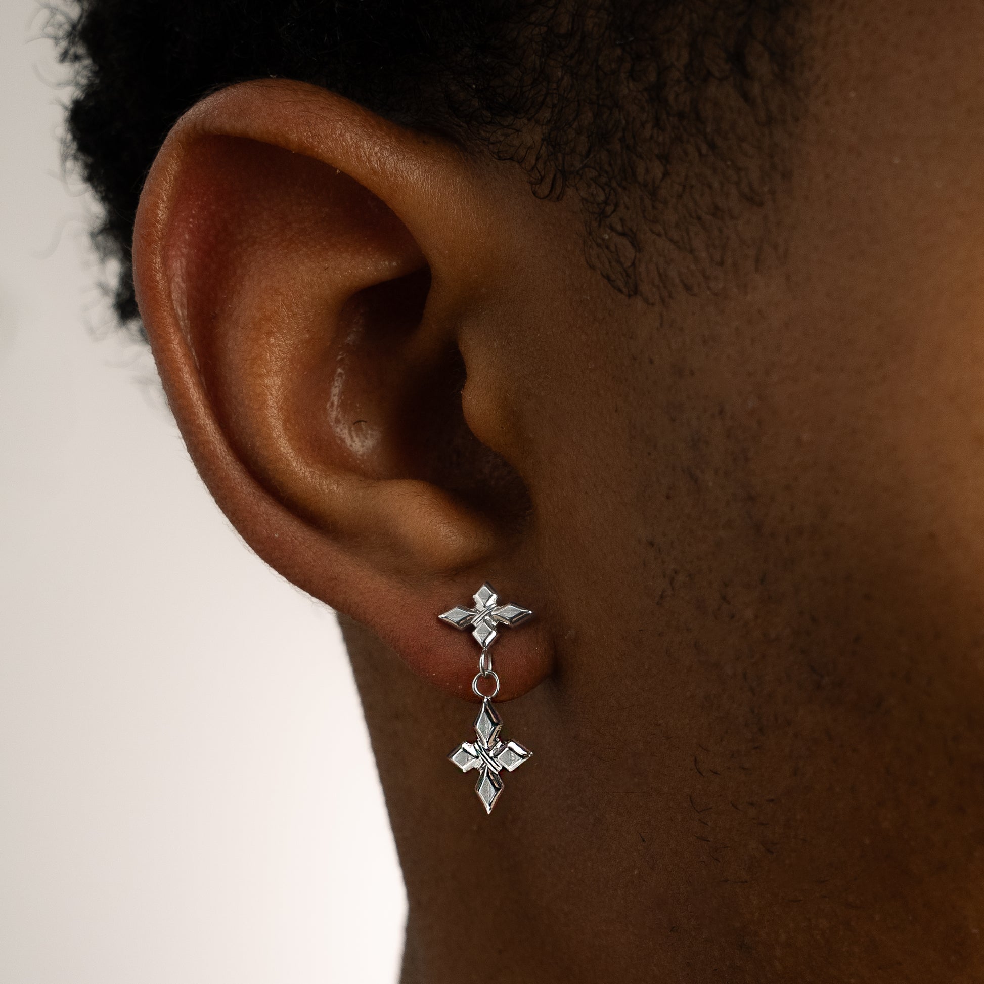 Each earring combines two sculpted star crosses, forming a perfect balance between strength and elegance.