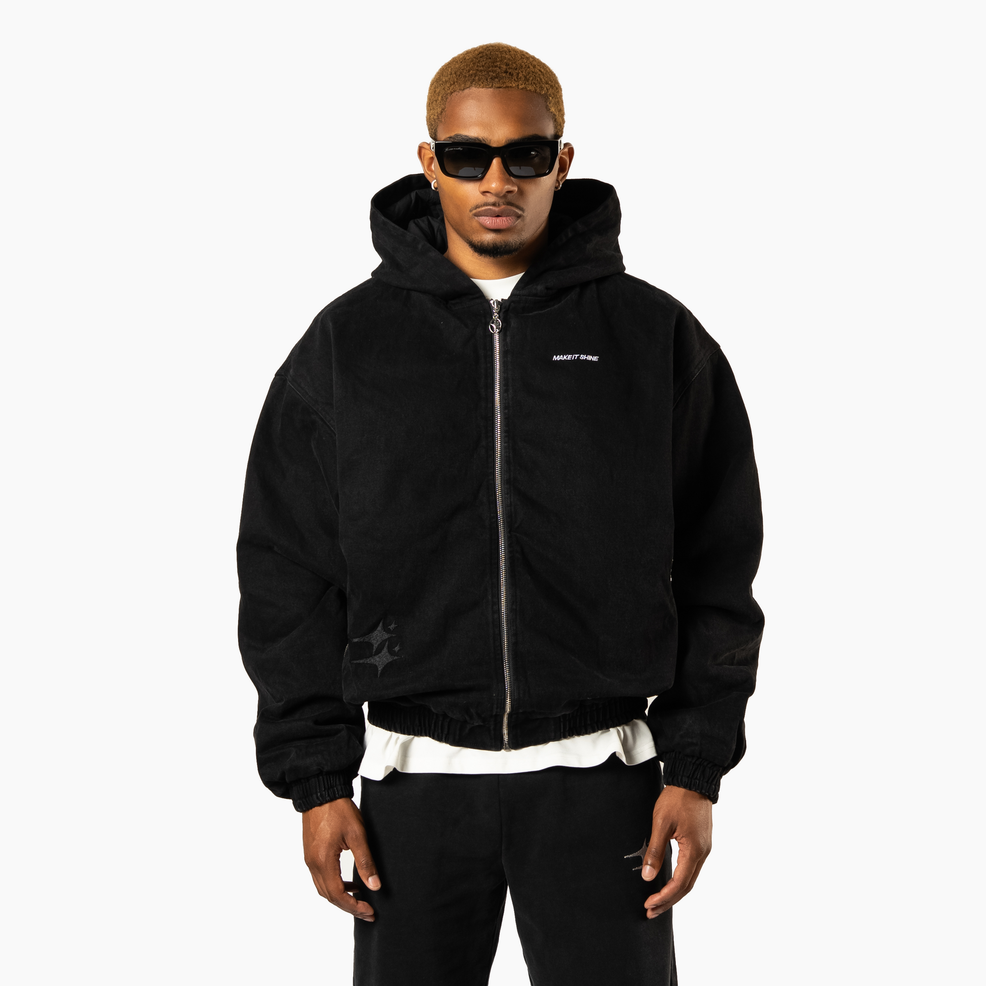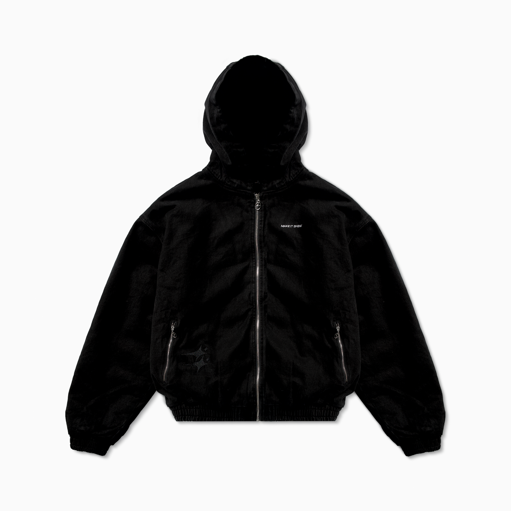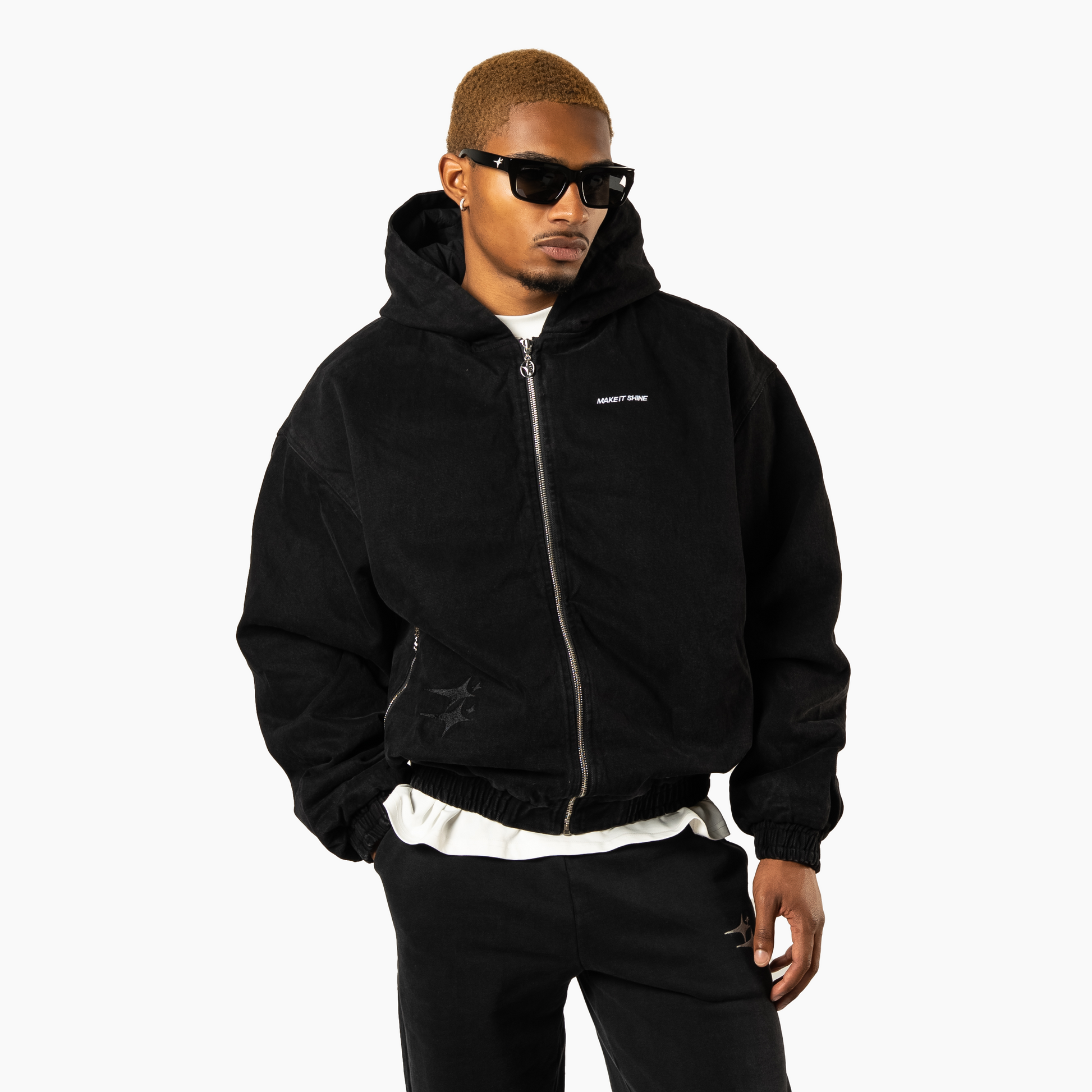 Black hooded denim bomber jacket, crafted from premium black denim. It features a structured fit with elasticated hem and cuffs, and a double front zip for added convenience. The hood adds an urban and functional touch, while the internal lining ensures comfort and durability.