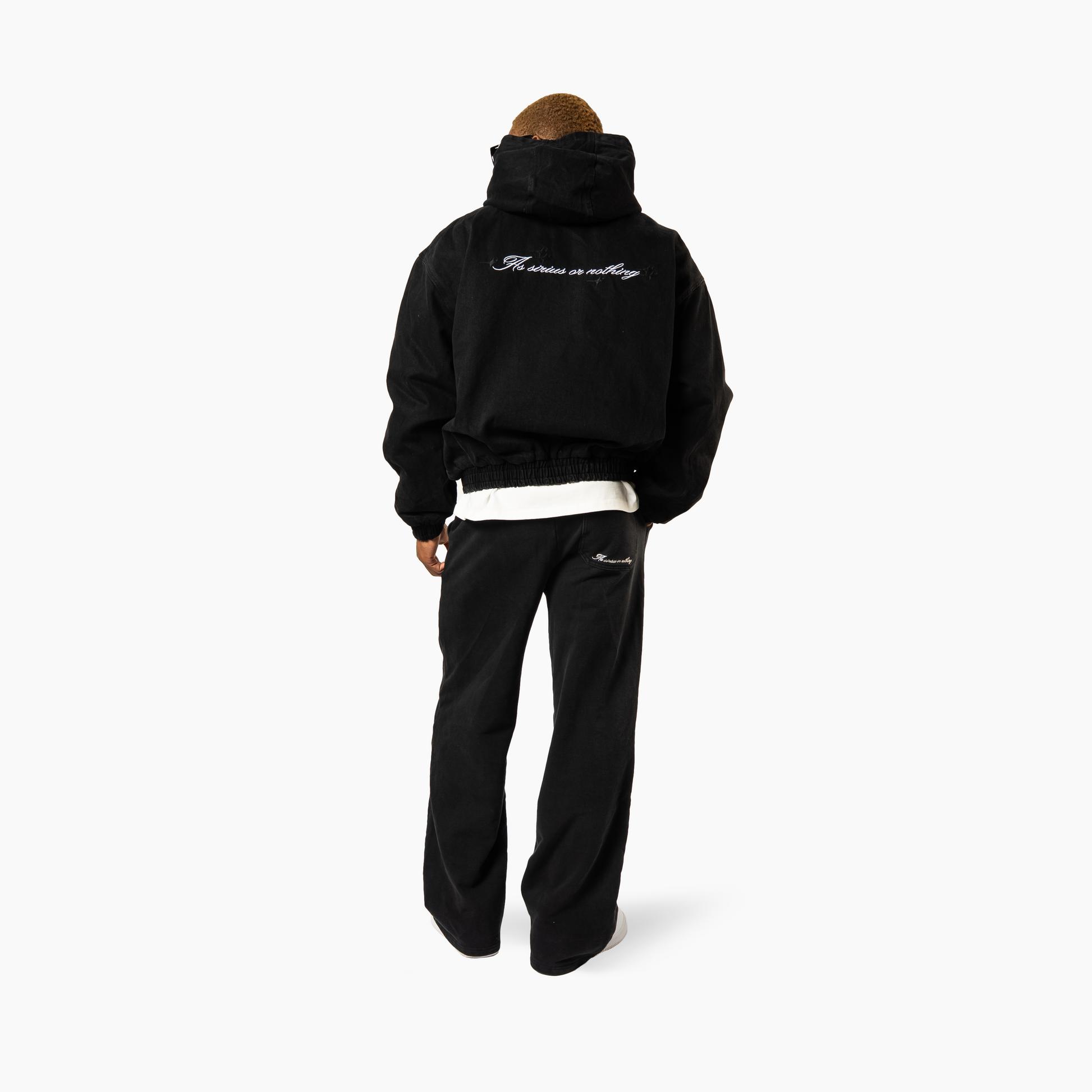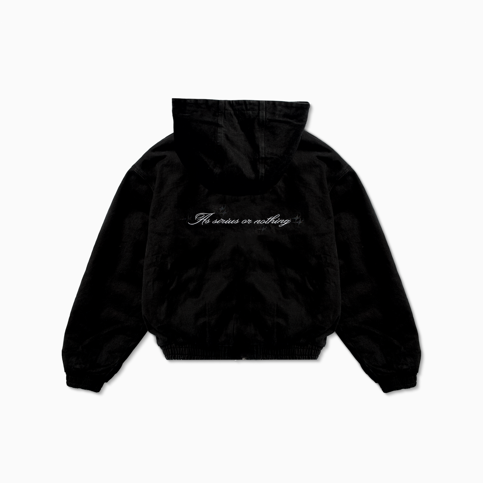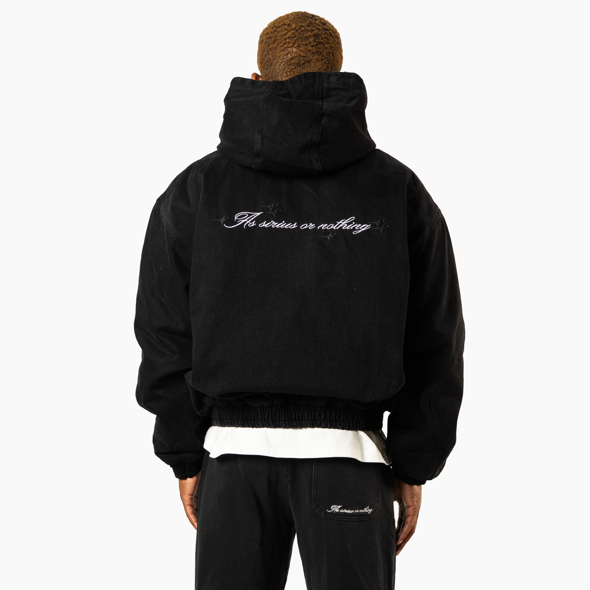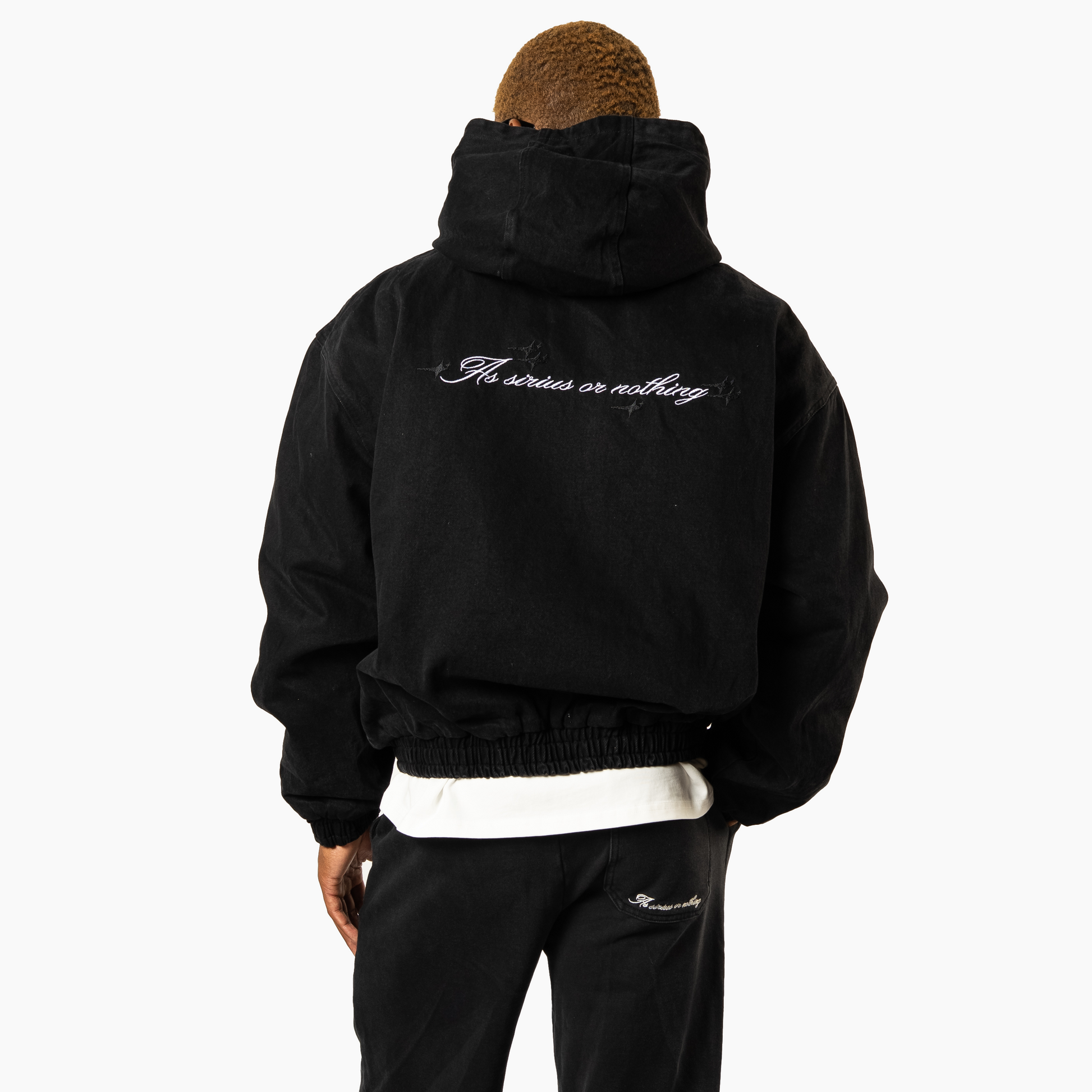 Black hooded denim bomber jacket, crafted from premium black denim. It features a structured fit with elasticated hem and cuffs, and a double front zip for added convenience. The hood adds an urban and functional touch, while the internal lining ensures comfort and durability.