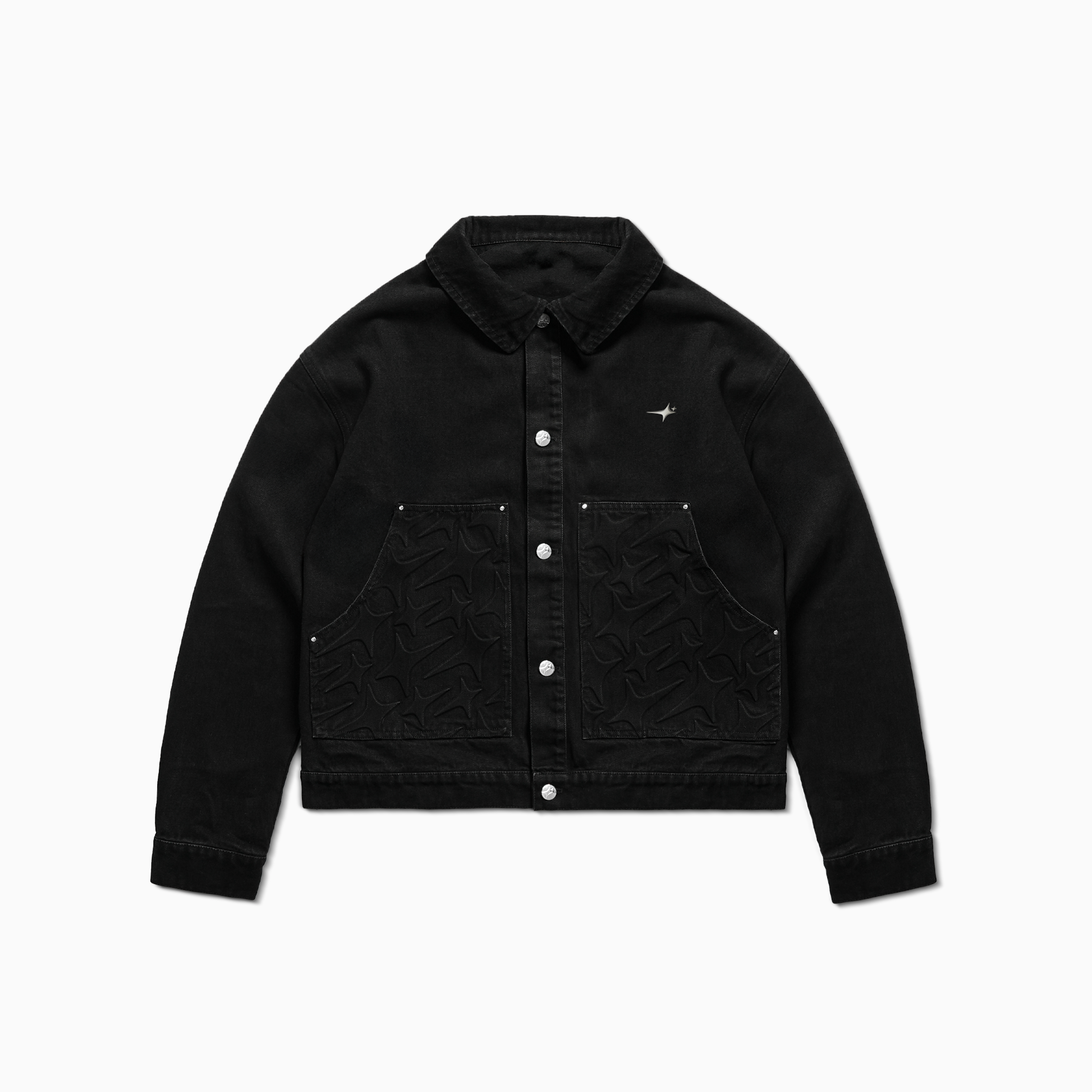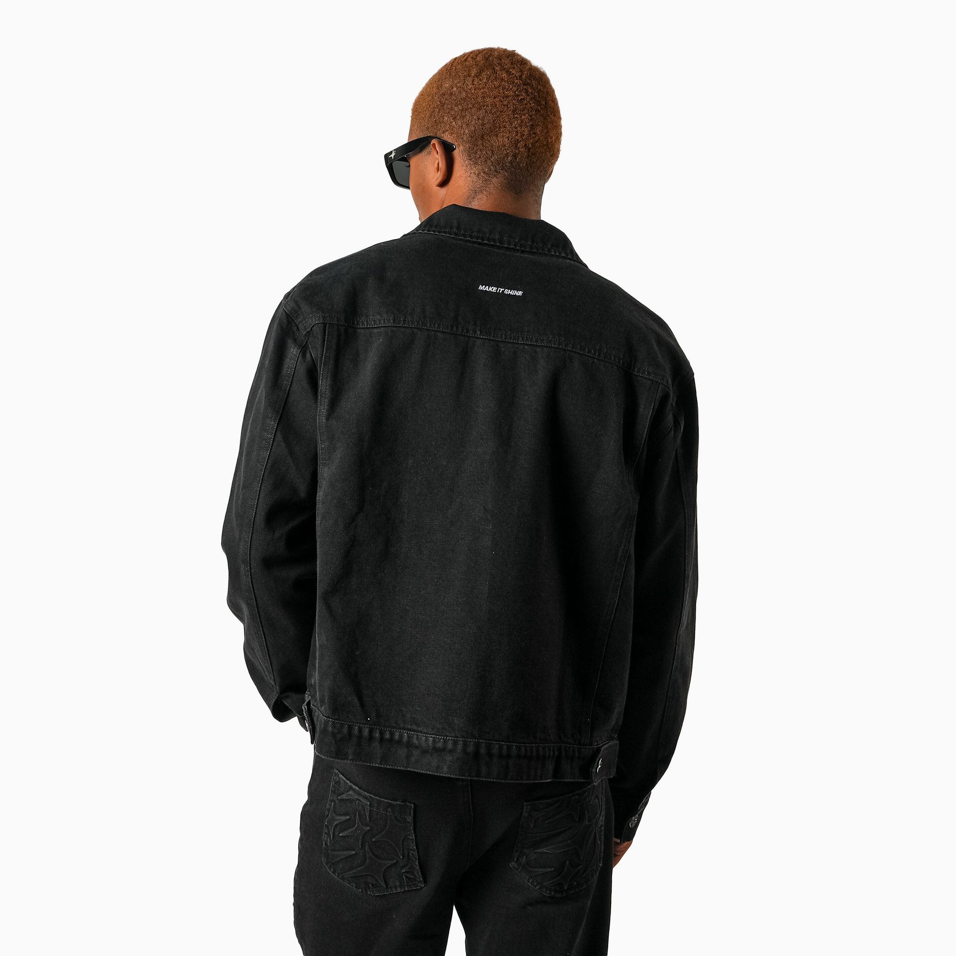 Black denim jacket with long sleeves and a straight fit. Embossed monogram on the front pockets. Structured collar, button closure with silver metal buttons. Make It Shine metal logo on the chest. “Make It Shine” embroidered in white on the back.