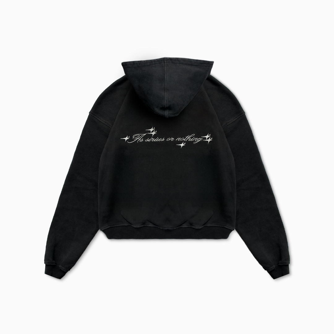 Washed black long-sleeved hoodie with an oversized fit, made from premium heavyweight cotton. Lined hood and kangaroo pocket at the front.