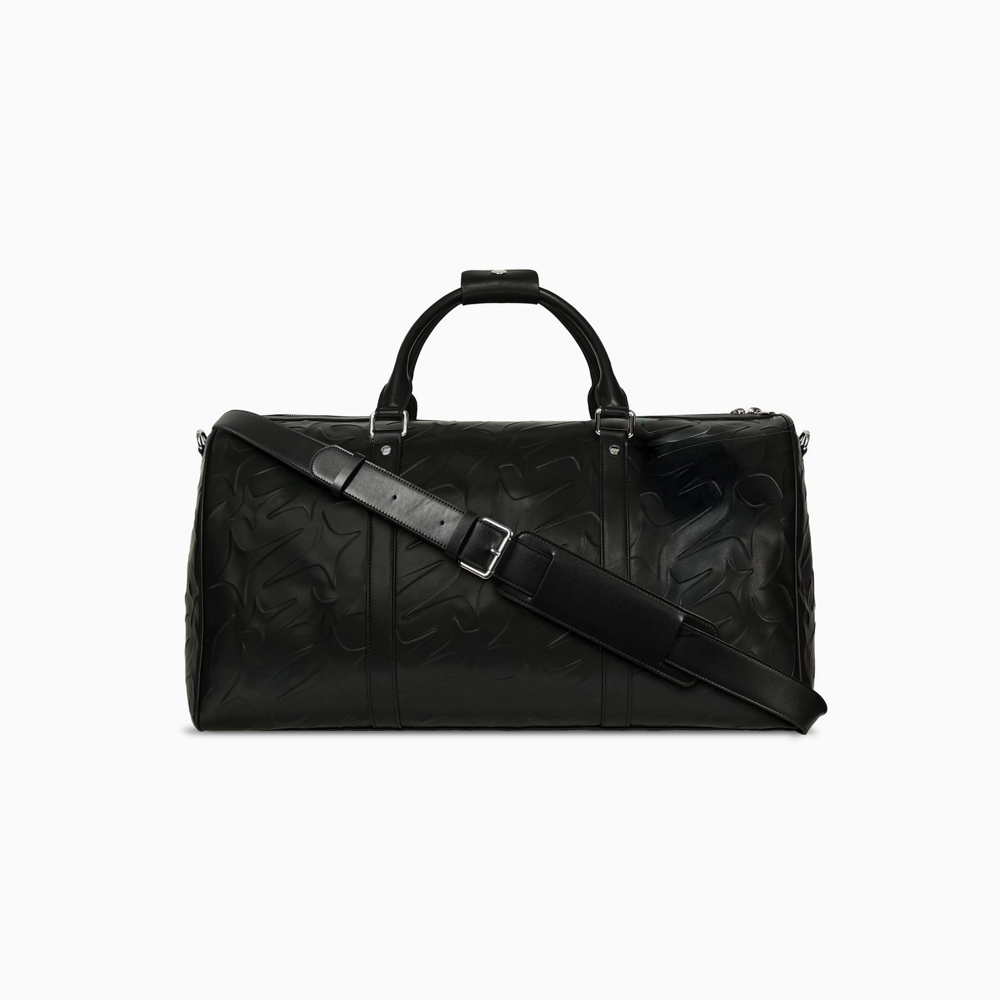 The Monogram Travel Bag, crafted in black faux leather, combines functionality with bold design. It's designed to accompany you on all your travels, from everyday life to travel. Its style is marked by the embossed Make It Shine monogram, which adds a detailed texture, and by the 3 cm metallic logo, the house's iconic signature. Practical and elegant, it's the ideal companion for an urban and sophisticated look.