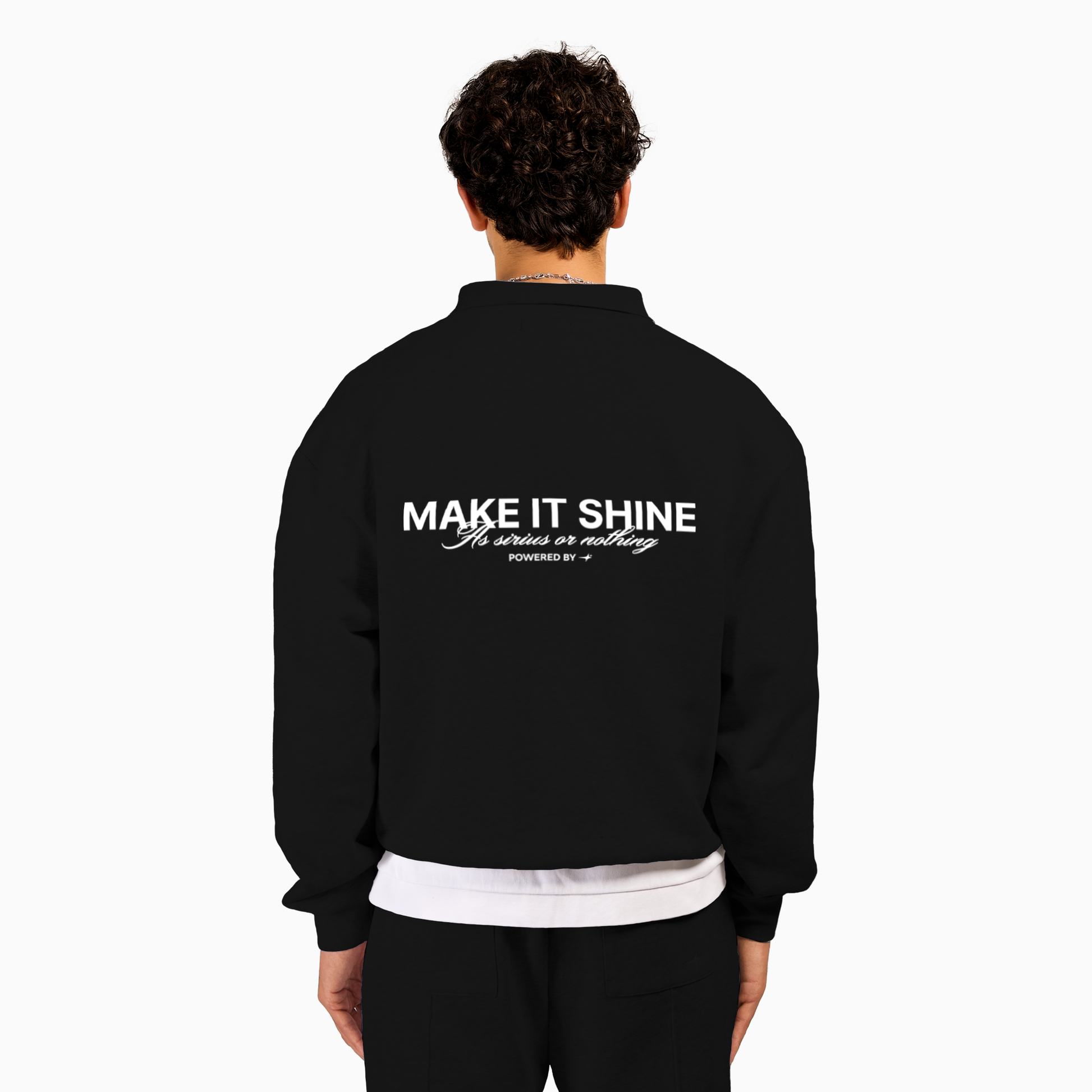 Black long-sleeved jersey polo sweater with an oversized fit, made from premium heavyweight cotton. Polo collar with snap fasteners. Ribbed hem and cuffs.