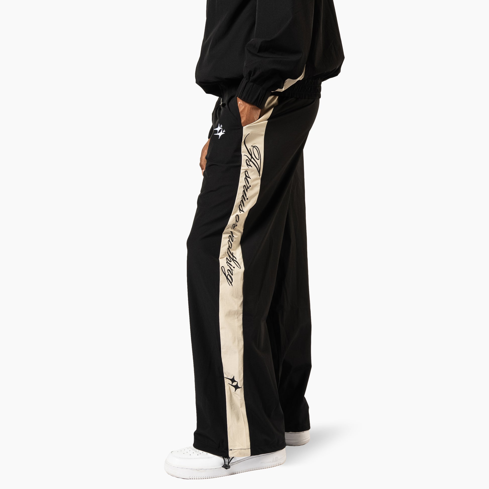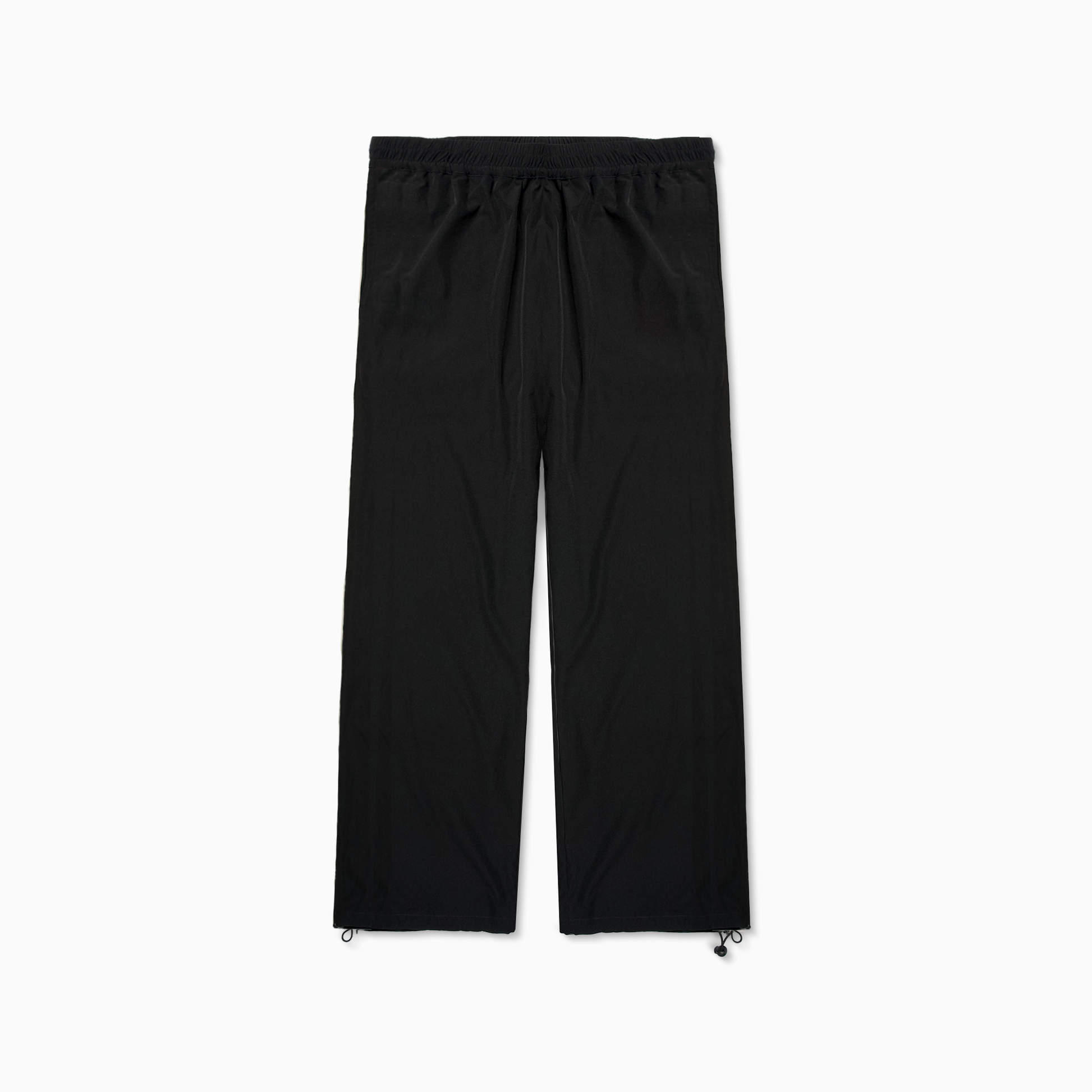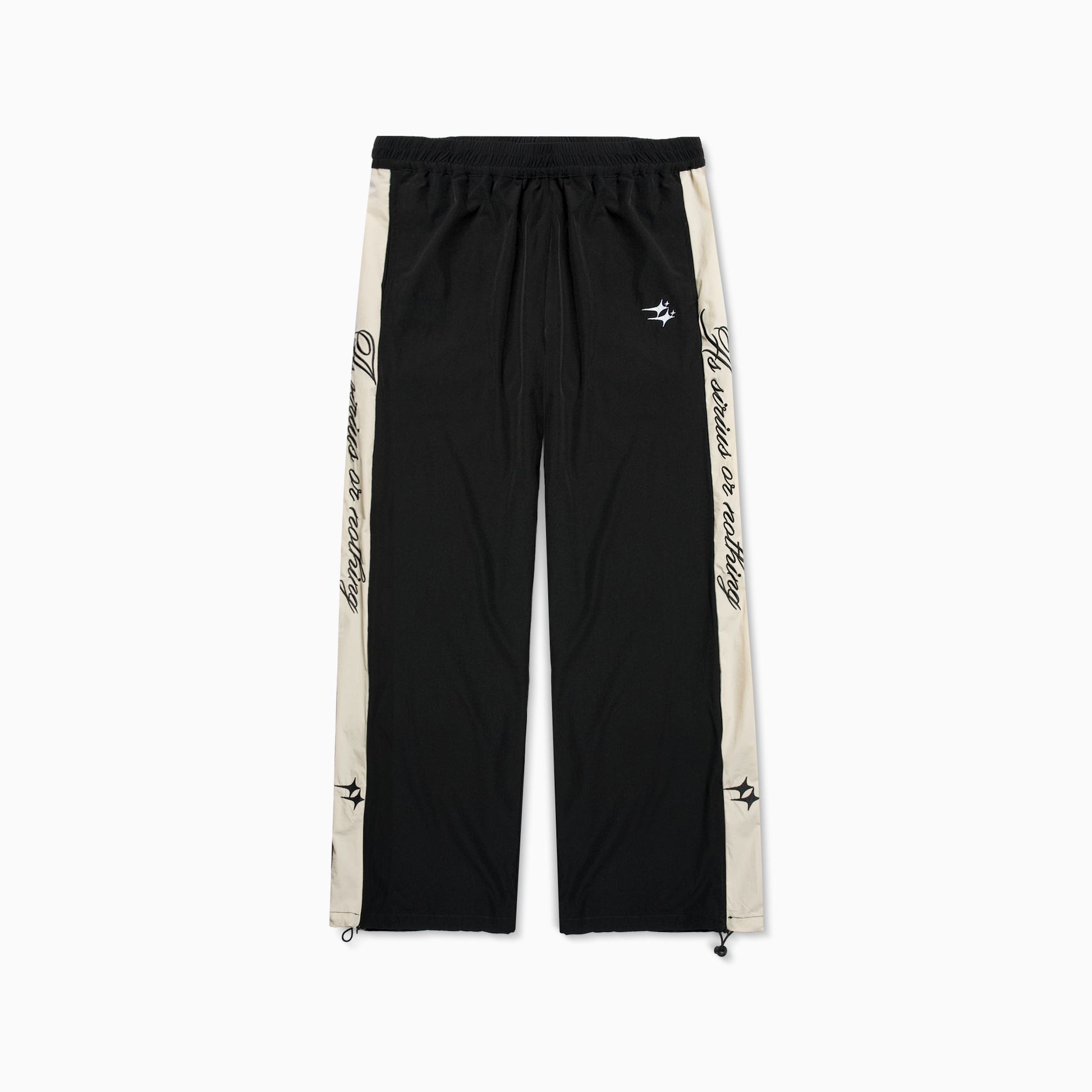 Black nylon sport tech pant , designed to combine comfort and a sporty look. Its loose, lightweight cut is highlighted by beige side stripes adorned with the inscription “As Sirius Or Nothing” . The double Make it Shine logo is embroidered in black on each stripe, while a white logo embroidery is added to the front for a distinctive finish.