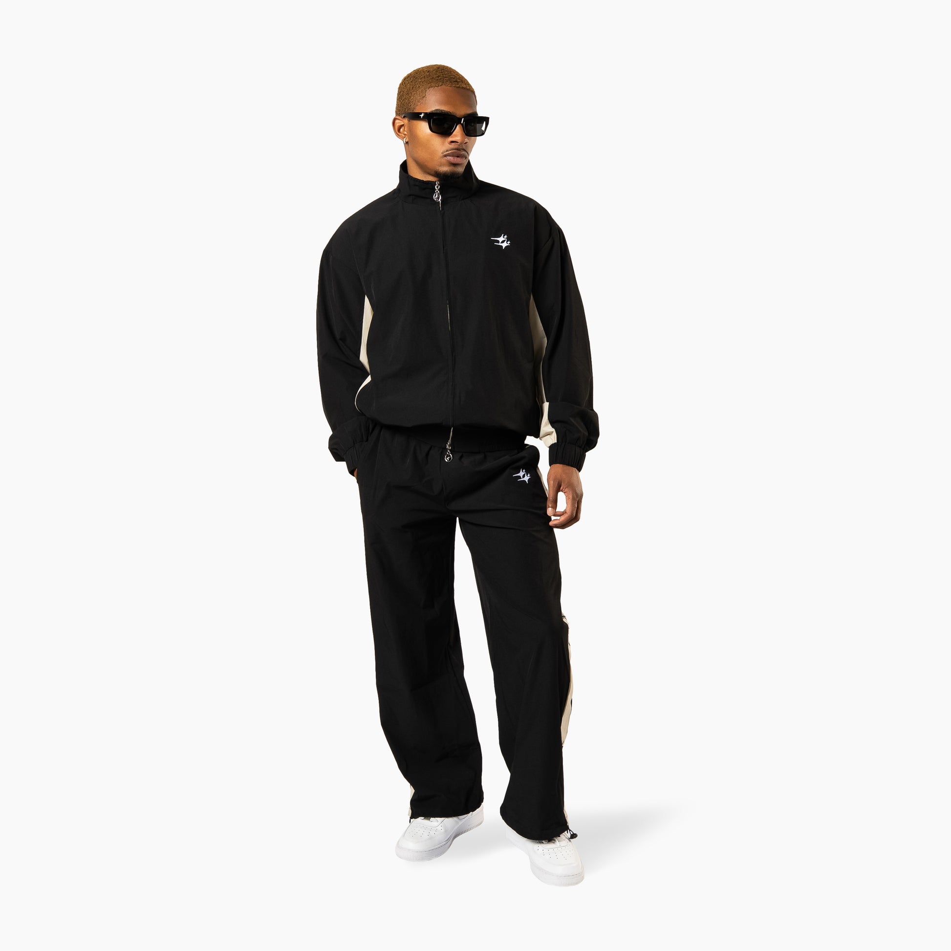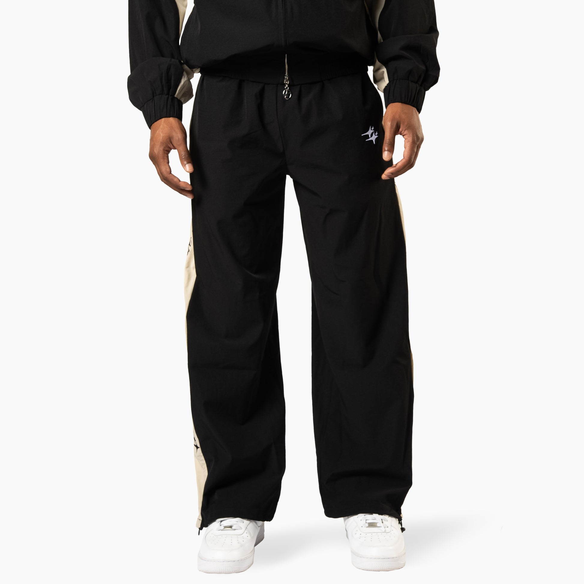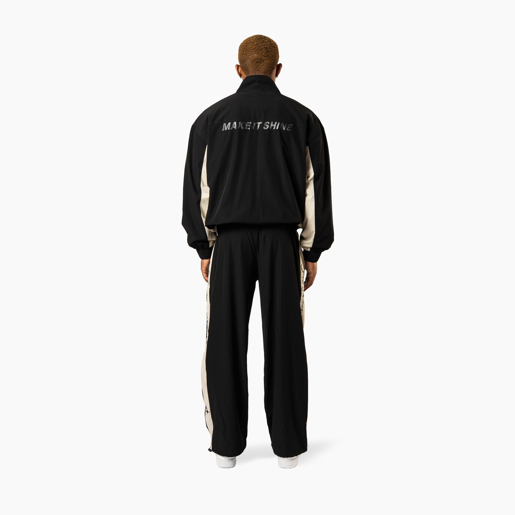 Black nylon sport tech pant , designed to combine comfort and a sporty look. Its loose, lightweight cut is highlighted by beige side stripes adorned with the inscription “As Sirius Or Nothing” . The double Make it Shine logo is embroidered in black on each stripe, while a white logo embroidery is added to the front for a distinctive finish.