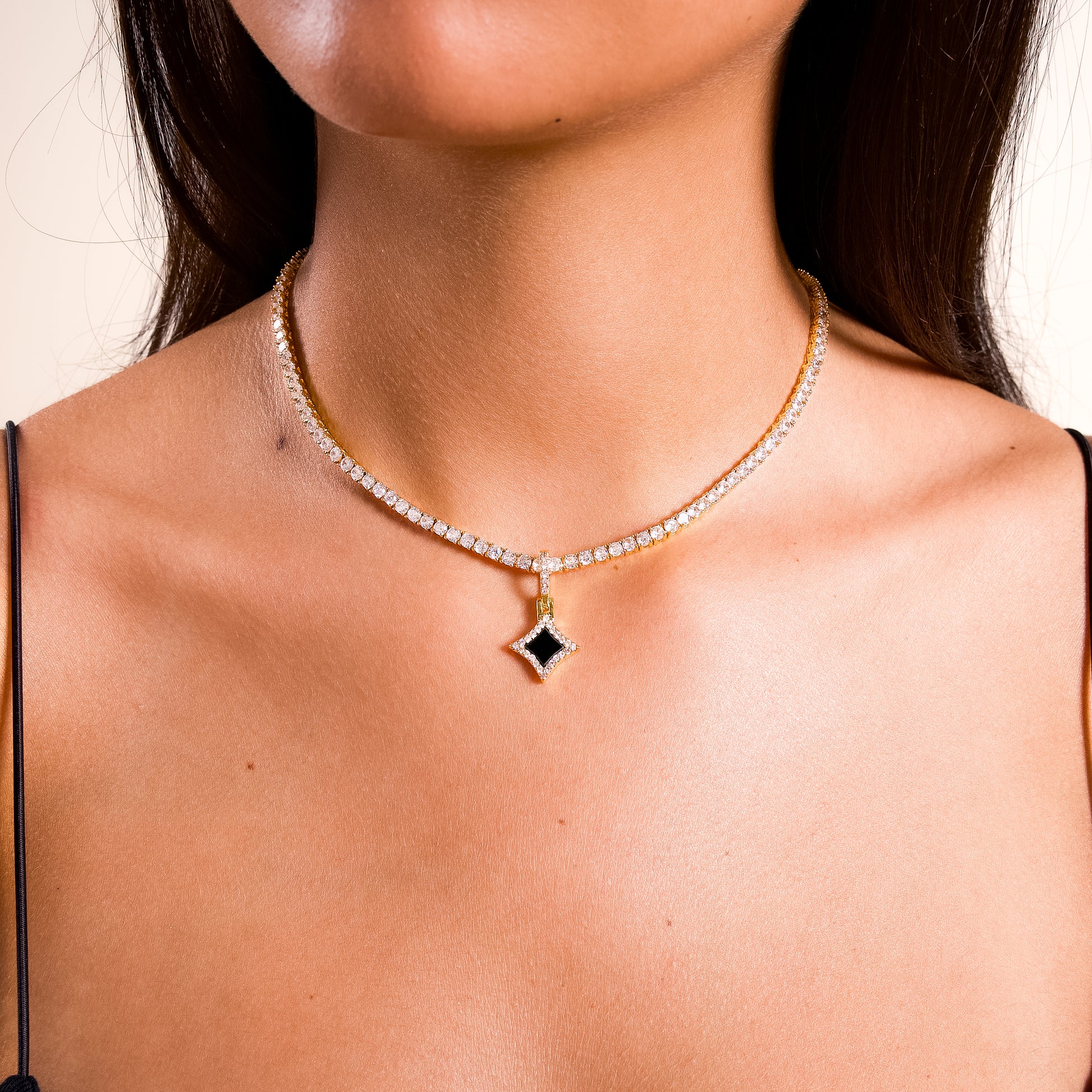 Here is our Star pendant, combining elegance and brilliance. At the heart of this jewel, a star encrusted with sparkling stones highlights a central stone in imitation onyx, offering a thickness of 8 mm for a subtle and luminous charm.